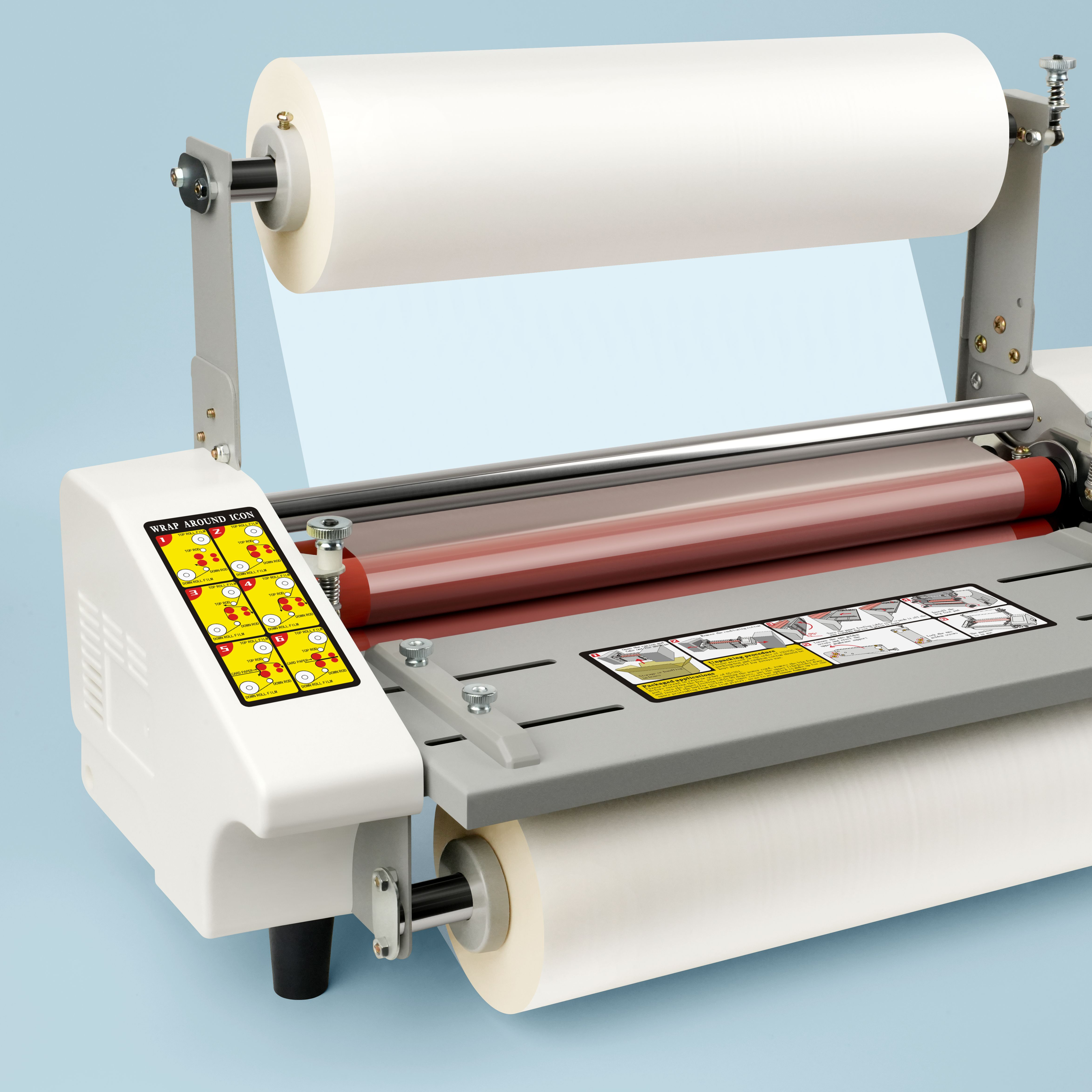 - Cấu tạo kỹ thuật gồm có 4 Rulo ép màu đỏ chất liệu silicon có độ bền rất cao, không bị nổ hay phồng bong bóng khi cán các sản phẩm đã in.