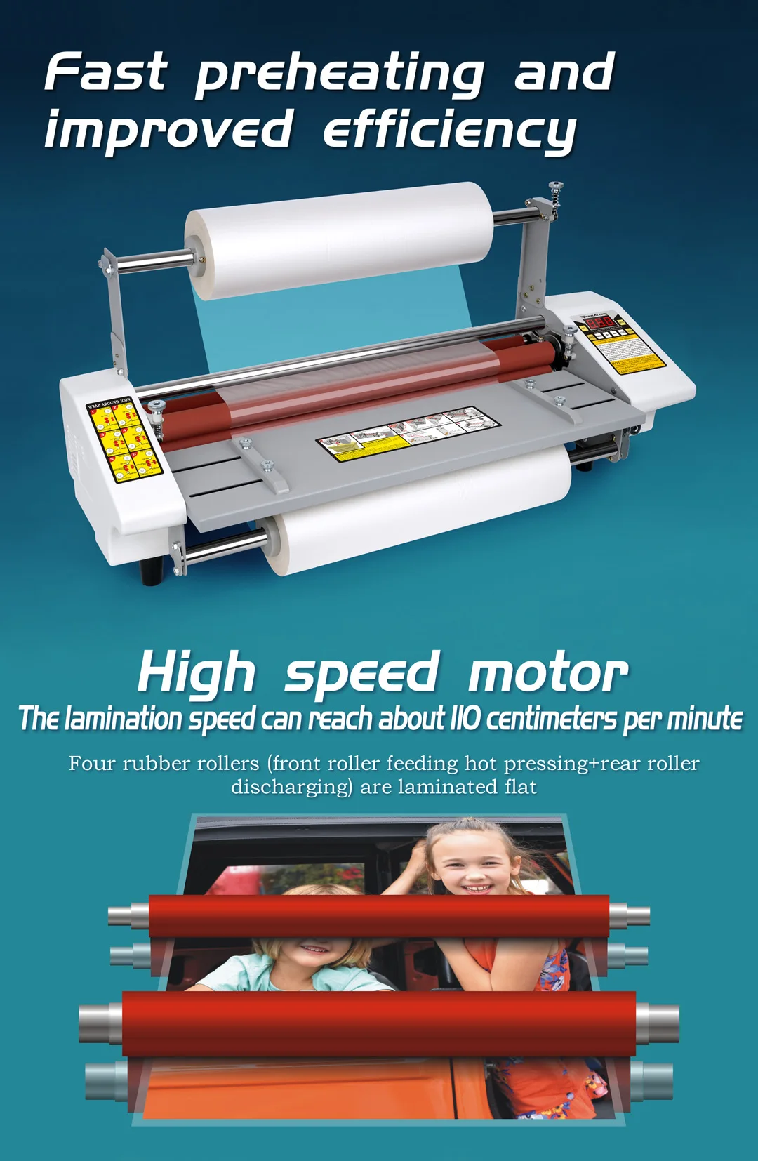 Nhờ vào cấu tạo 4 trục Rulo bao gồm 2 trục nóng và 2 trục nguội nên dòng máy này có khả năng làm nóng siêu nhanh chỉ từ 3-5 phút. Bao quanh các trục Rulo là một lớp silicon mềm min và siêu bền giúp cho máy có thể cán màng nhiệt một cách chắc chắn lên bề mặt giấy.