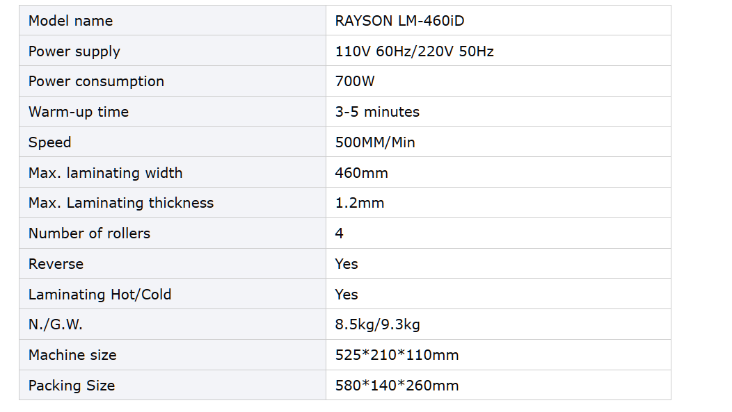 Máy ép Plastic Rayson LM–460 ID là thiết bị ép nhựa khổ lớn chất lượng cao, được ưa chuộng trong các văn phòng, trường học, tiệm photocopy và dịch vụ in ấn. Máy sở hữu thiết kế chắc chắn, vận hành ổn định, giúp bảo quản tài liệu, hình ảnh, chứng chỉ, thẻ nhựa một cách chuyên nghiệp và lâu bền.